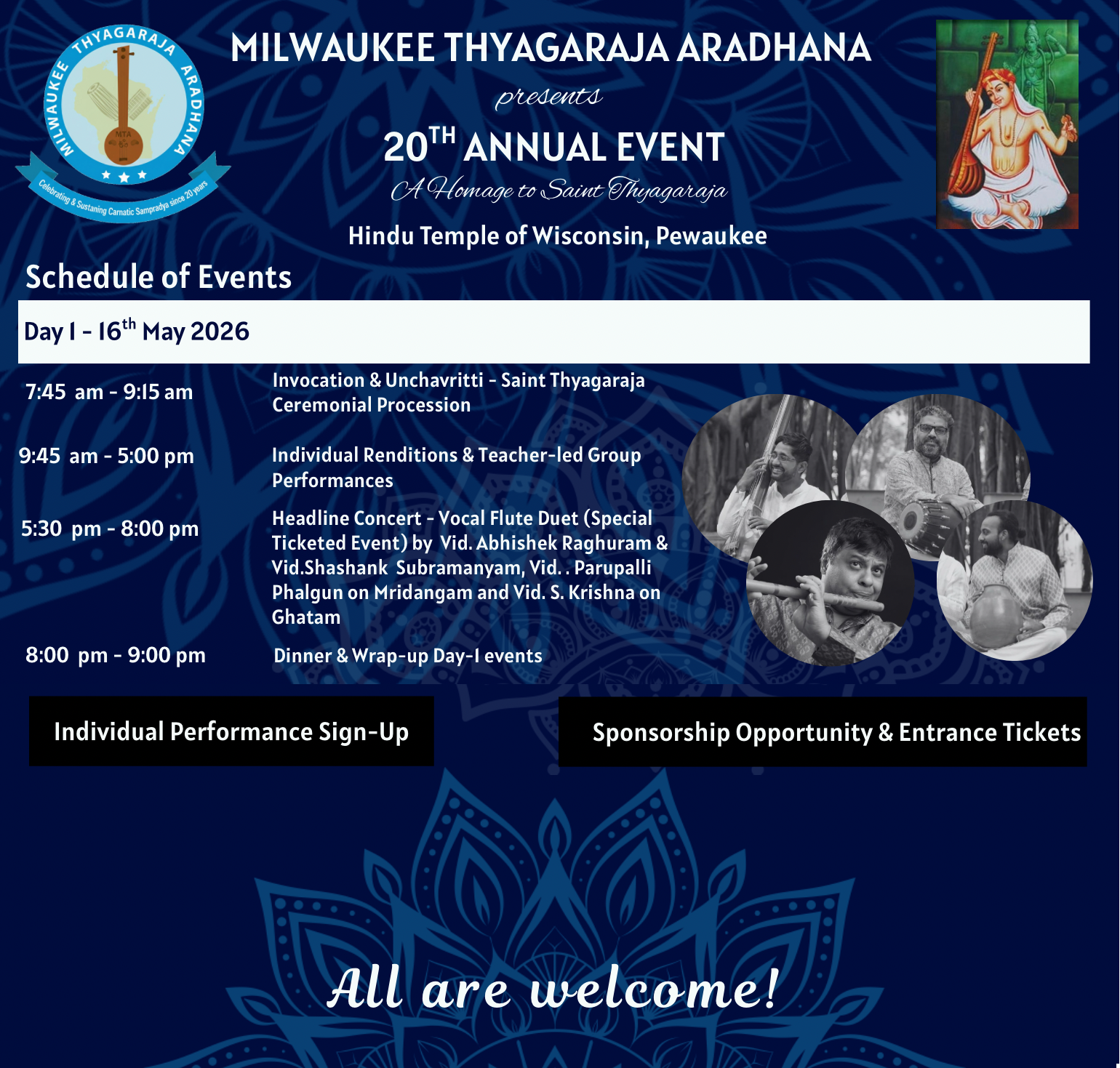 We are extremely humbled for the 20 years of support you have been giving to us and very eager and excited to bring you 2026 Thyagaraja Aradhana at Milwaukee, Wisconsin. Like every year, we have curated a 2 day program